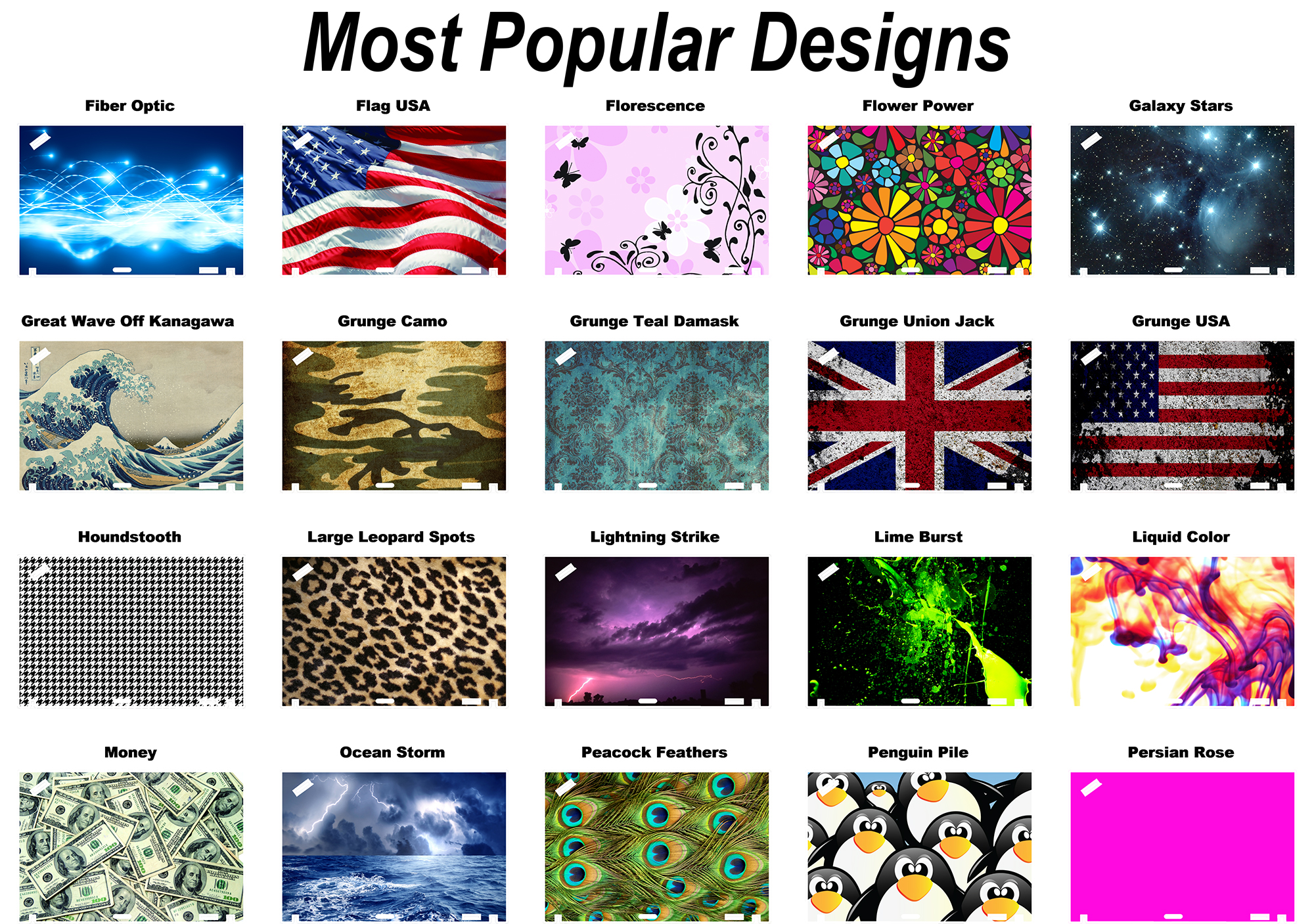 Our skins are made on large format professional printers and plotters from high-quality vinyl. Our adhesive allows the skin to be removable and repositionable during installation and then sticks strongly afterward. We use UV resistant inks and apply an additional UV resistant, scratch resistant, glossy laminate. This will ensure that your skins will look great for many years to come. The adhesive is quite strong but will allow the skin to come off in one piece and will not leave any residue behind or damage your device.